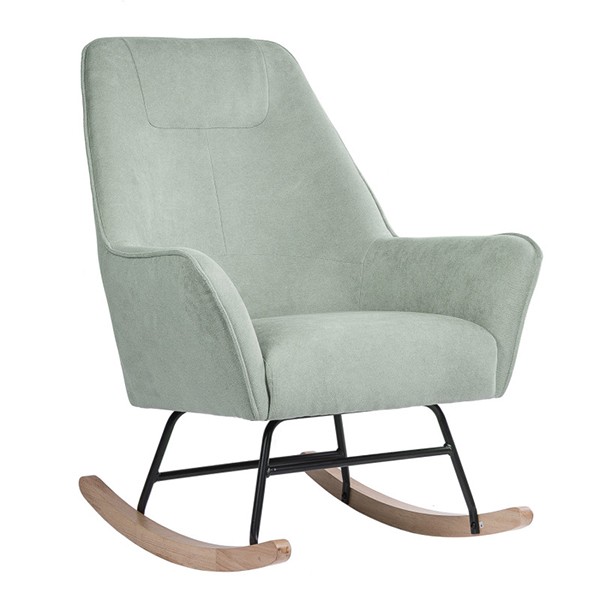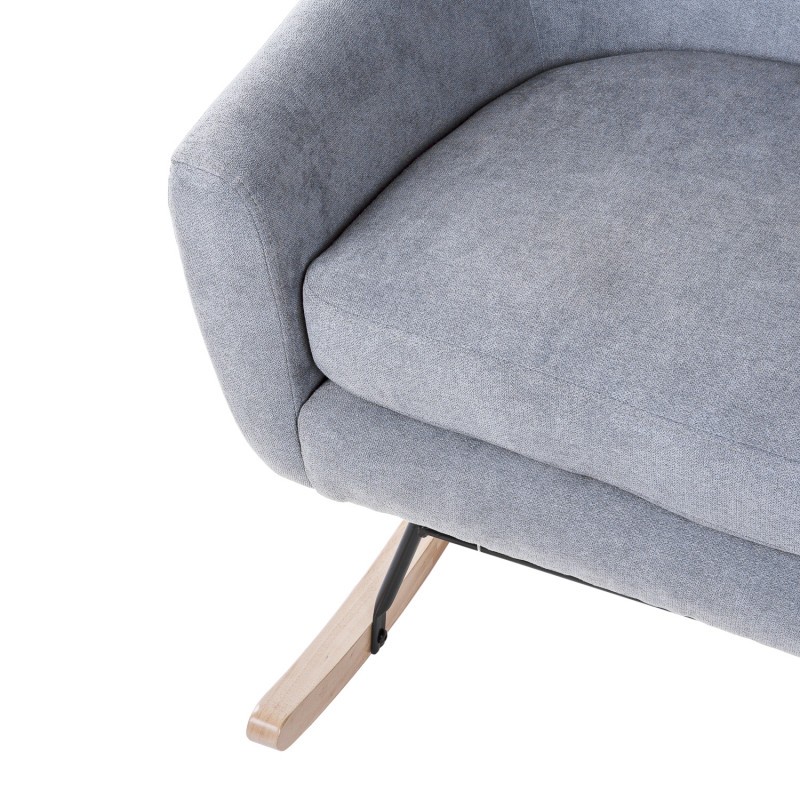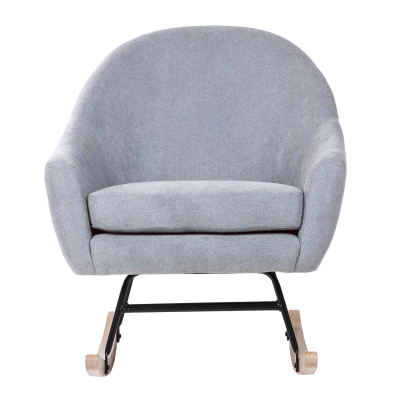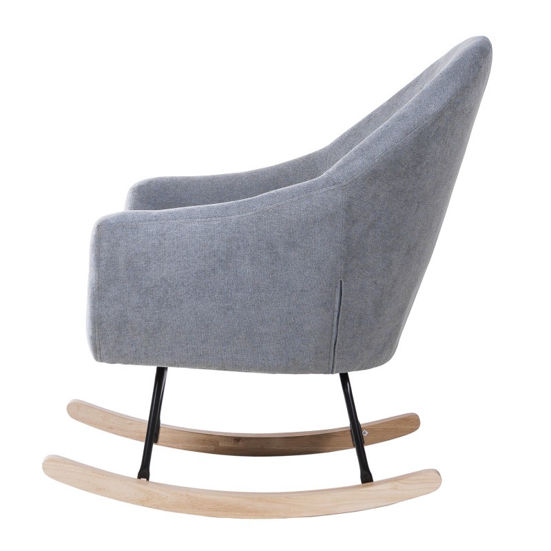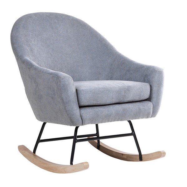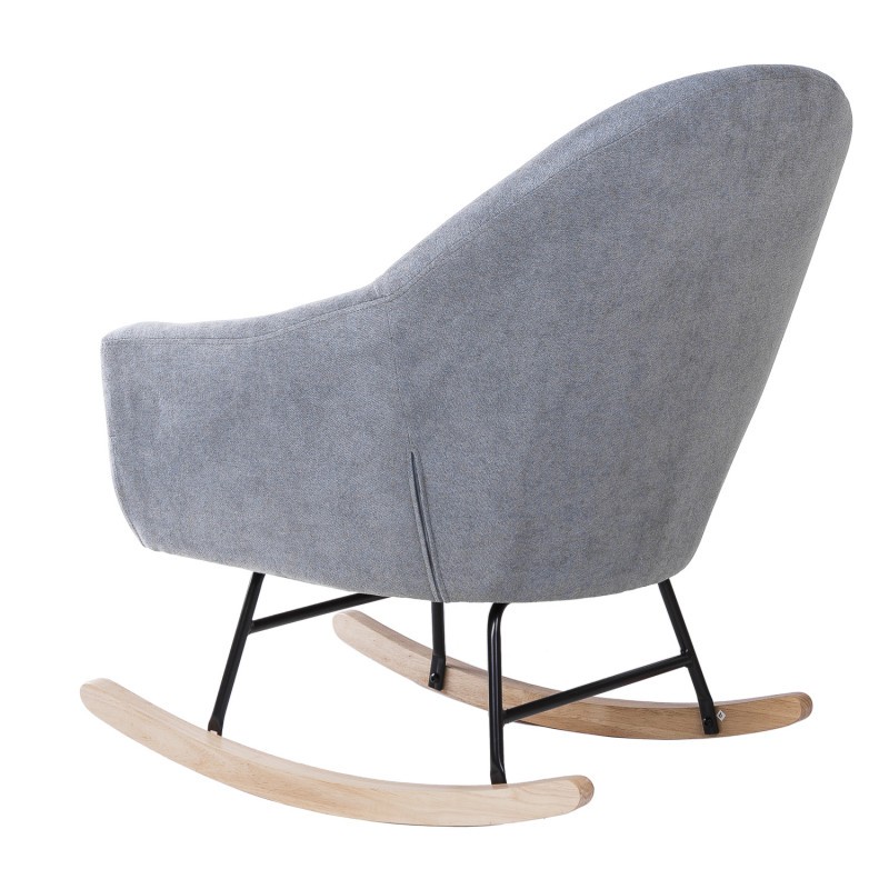 Silla mecedora de tejido gris claro, metal negro y madera