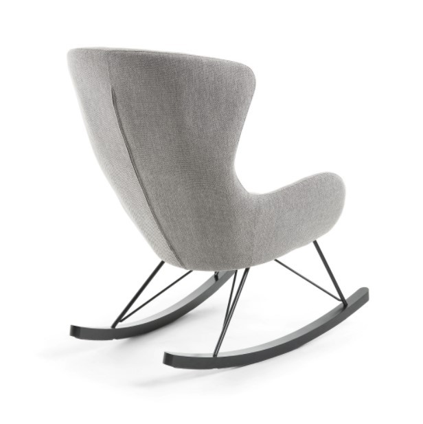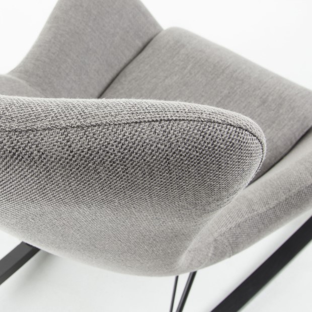 Vamos a centrarnos en la silla mecedora MARMON, un artículo que combina tres materiales distintos. Y es que el asiento y el respaldo están realizados mediante tejido de color gris, y se sostiene mediante una estructura de metal pintado por pulverización en color negro para concluir en dos pies en forma de patín diseñados en chapa de roble.