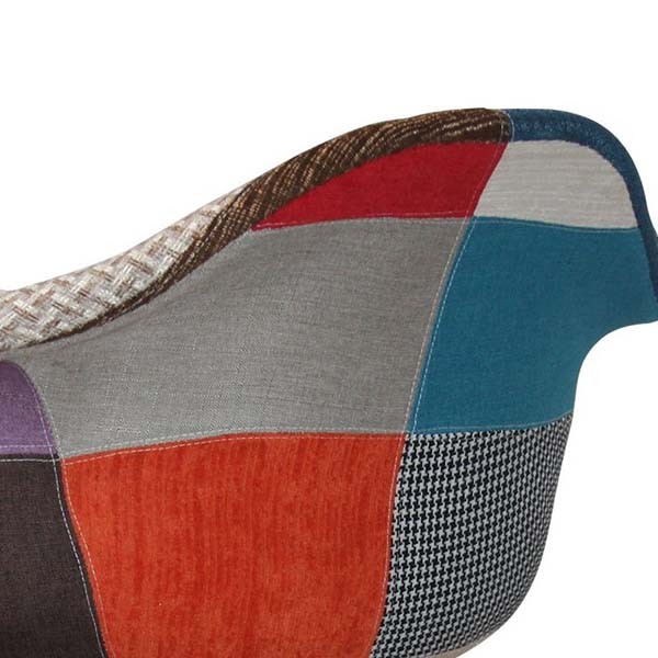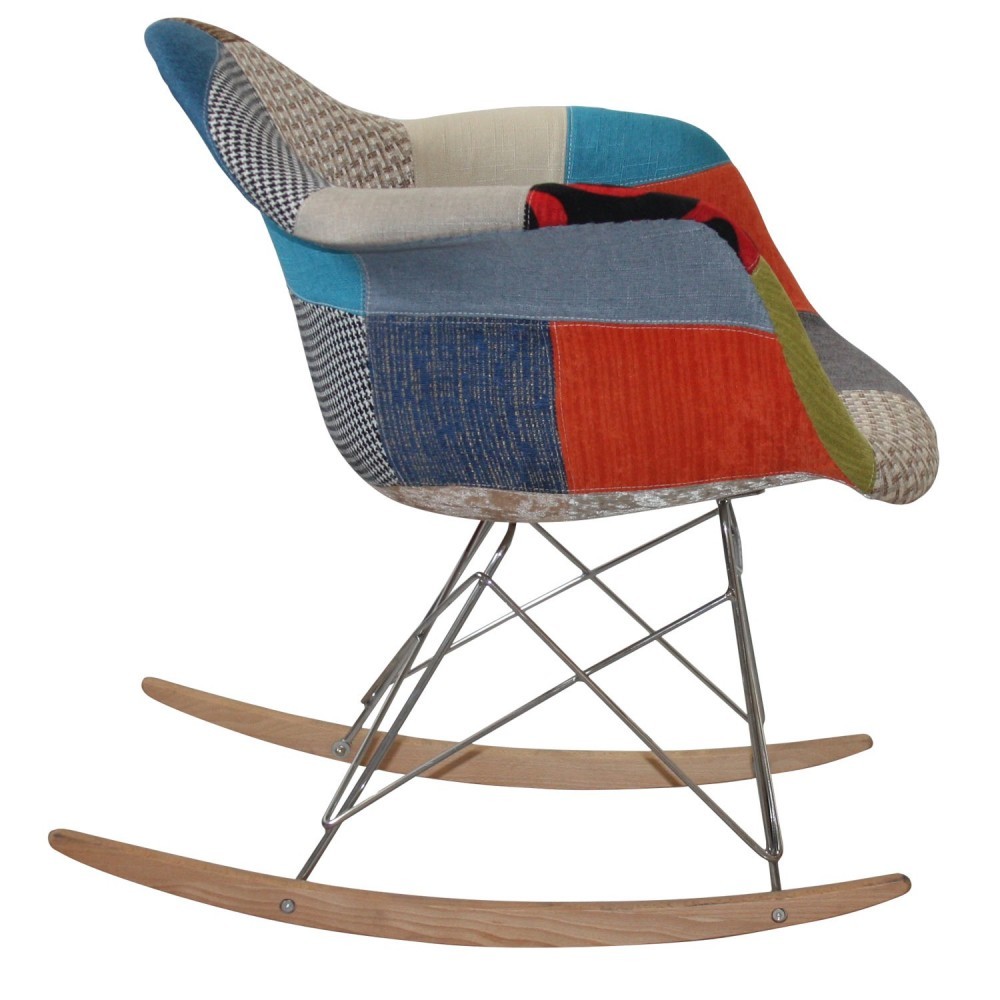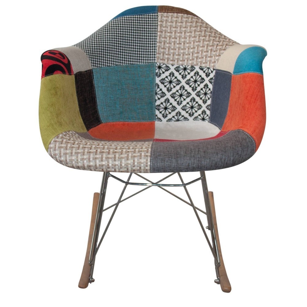 Silla mecedora TOW METAL ARMS con asiento con reposabrazos en una sola pieza tapizado en originales telas estilo patchwork y estructura de acero inspirada en la Torre Eiffel con pies del balancín en madera de haya.