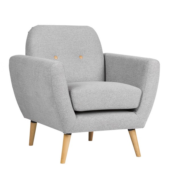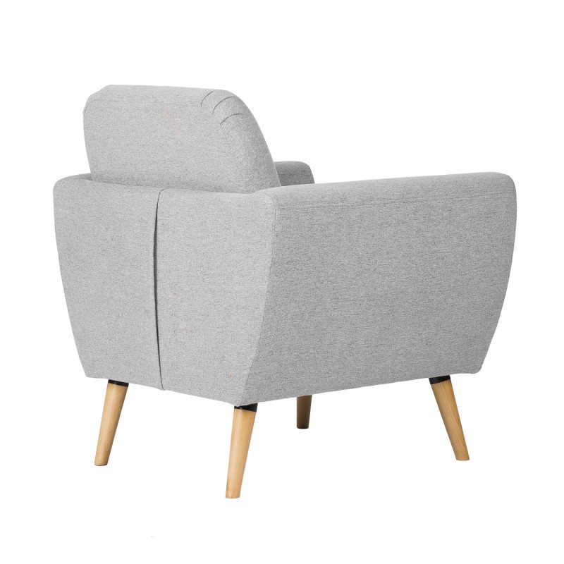 Sillón BOSTON tapizado en tejido gris claro y patas de madera en acabado natural.