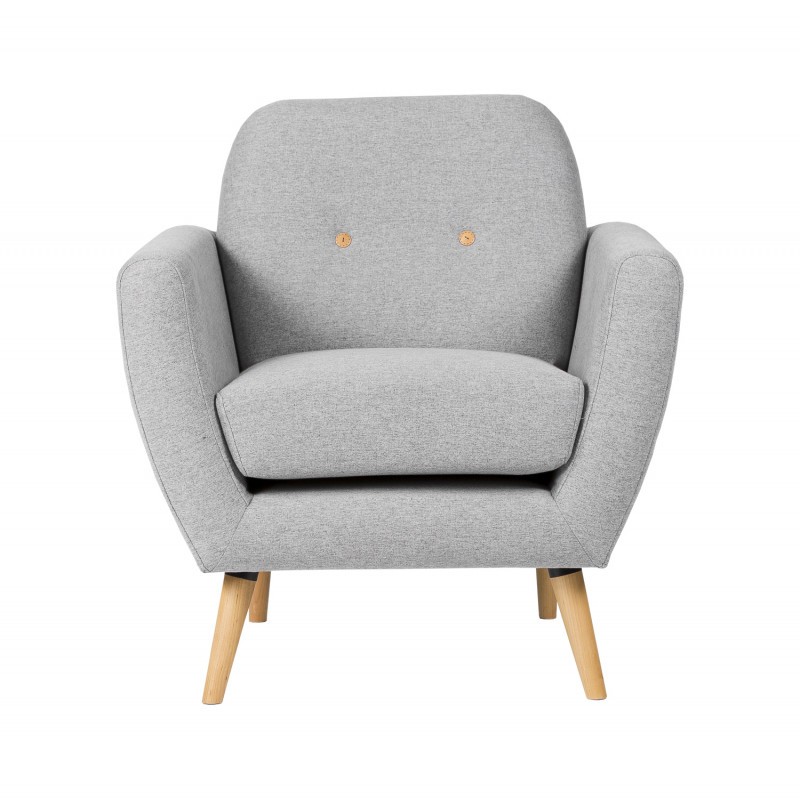 Sillón BOSTON tapizado en tejido gris claro y patas de madera en acabado natural. Medidas:  Medida alto: 86 cm. Medida ancho: 84 cm. Medida profundo: 79 cm. Medida alto asiento: 50 cm.