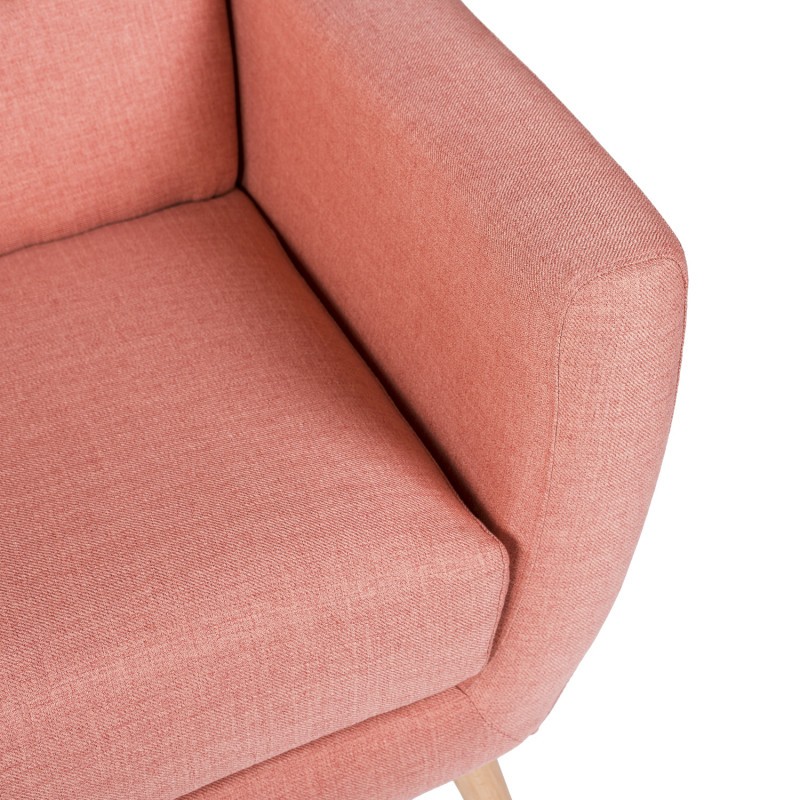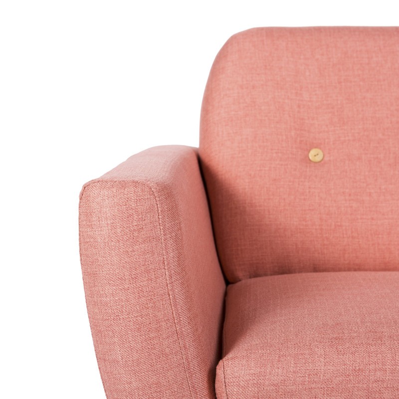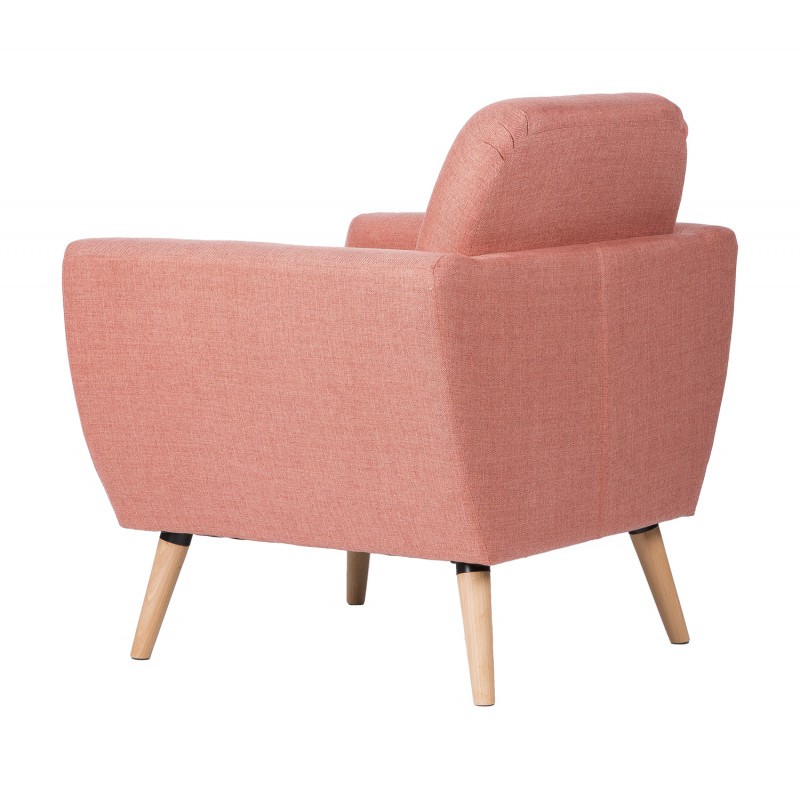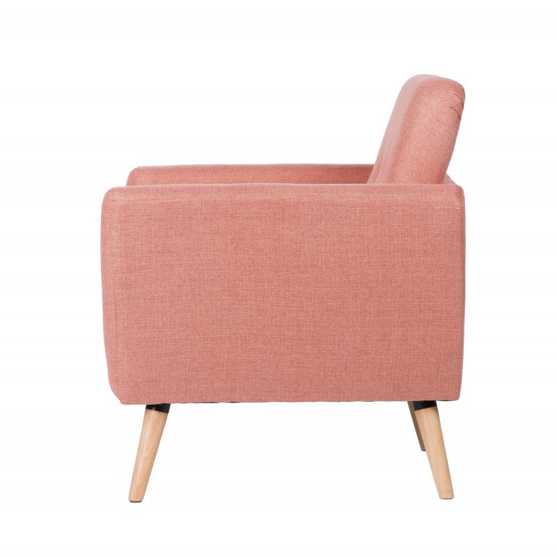 Sillón BOSTON tapizado en tejido rosa claro y patas de madera en acabado natural.