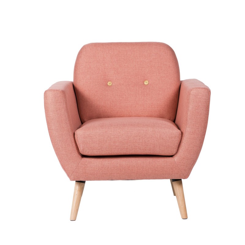 Sillón BOSTON tapizado en tejido rosa claro y patas de madera en acabado natural. Medidas:  Medida alto: 86 cm. Medida ancho: 84 cm. Medida profundo: 79 cm. Medida alto asiento: 50 cm.