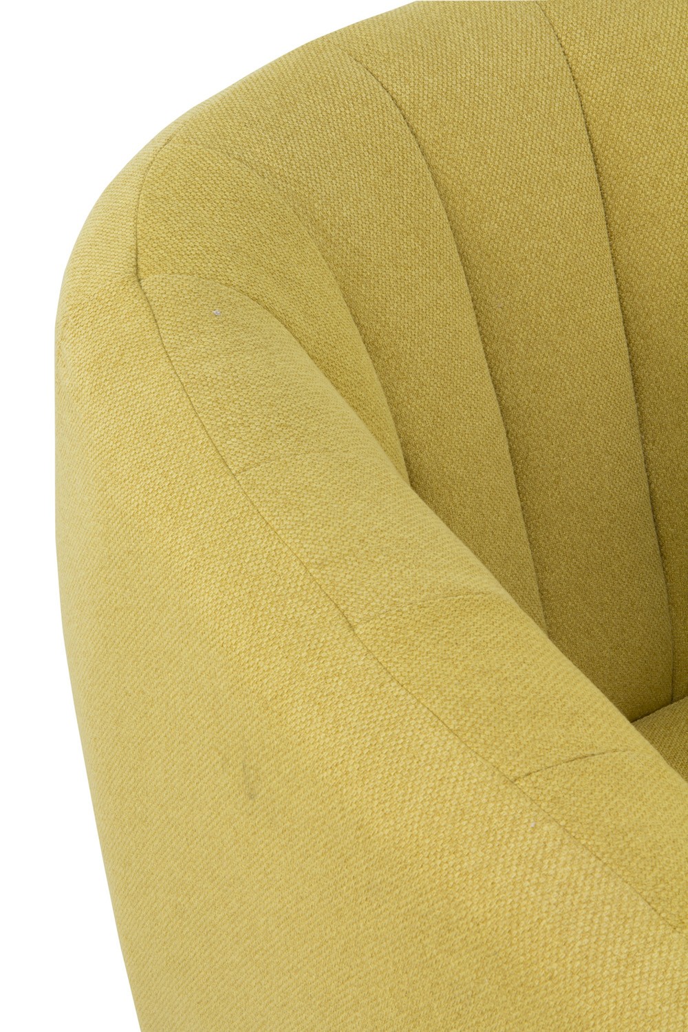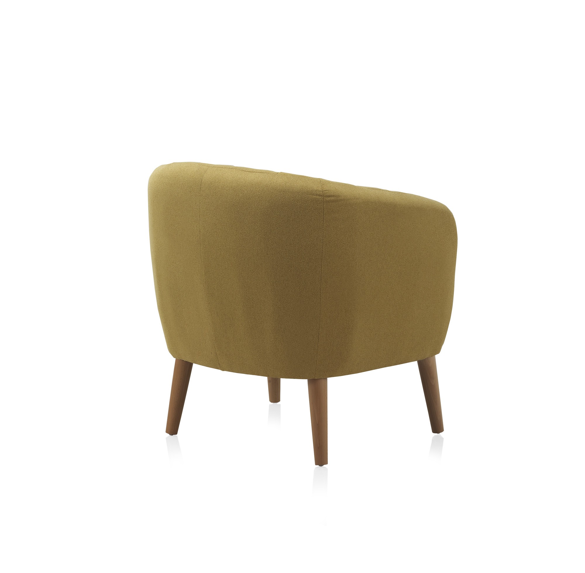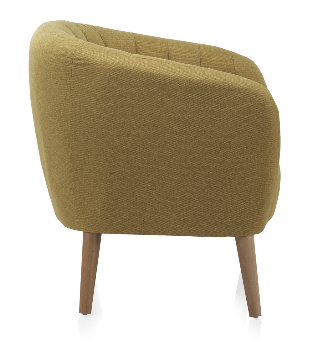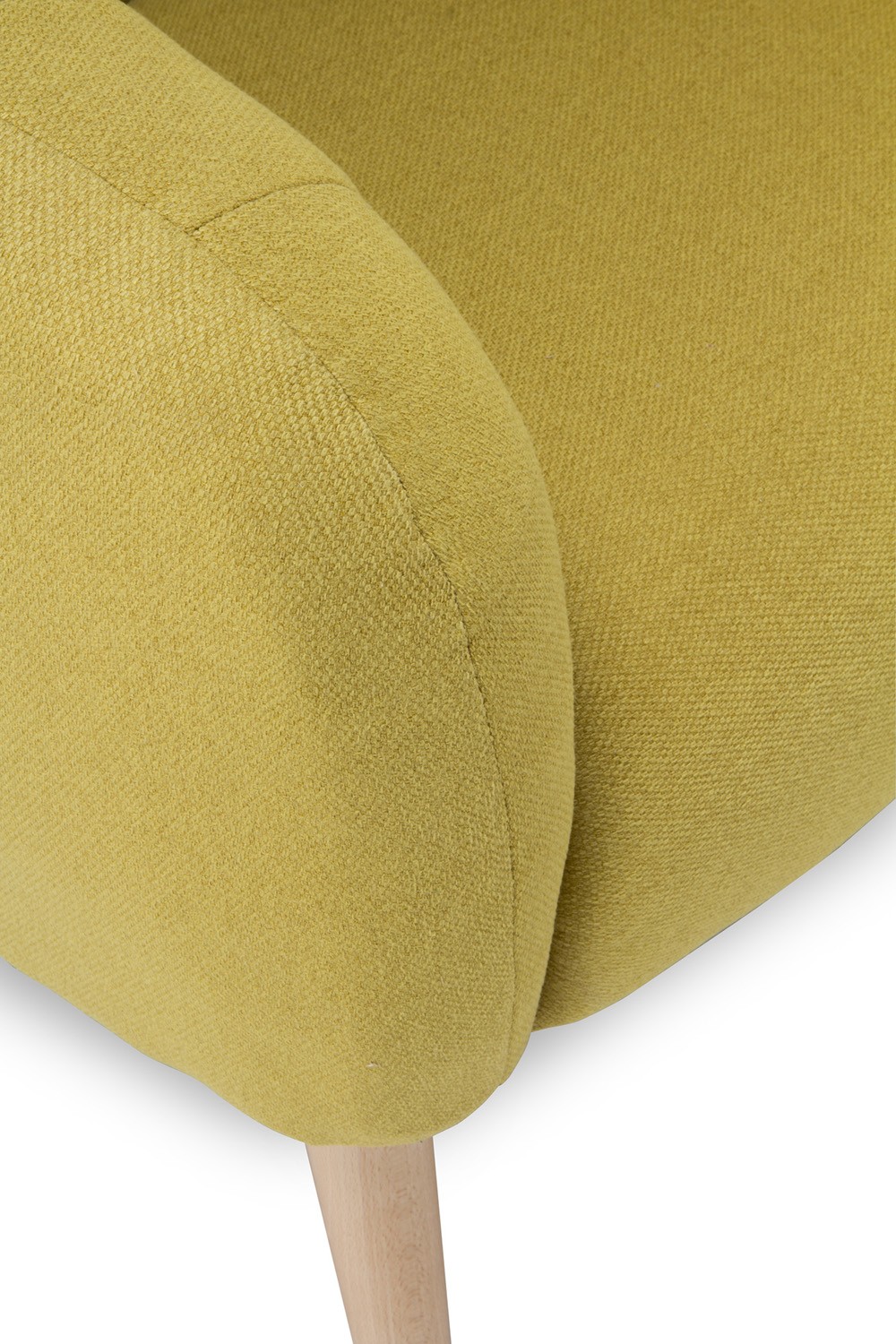 Cuenta con una estructura tapizada en tejido acabado en color mostaza, y se presenta en una forma ligeramente redondeada. Gracias a esta forma, nuestro cuerpo queda perfectamente encajado, y la sensación de relax hará que no te quieras levantar de el. También dispone de cuatro patas realizadas en madera de haya en acabado natural.