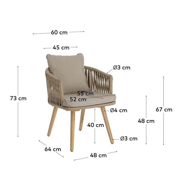 Se presenta con una estructura de asiento en aluminio con reposabrazos, cubierto por una cuerda trenzada a mano de polietileno y patas firmes de madera de acacia. Viene acompañado de cojines desenfundables aptos para el exterior, resistentes al agua en caso de lluvia, y aptos para la lavadora.