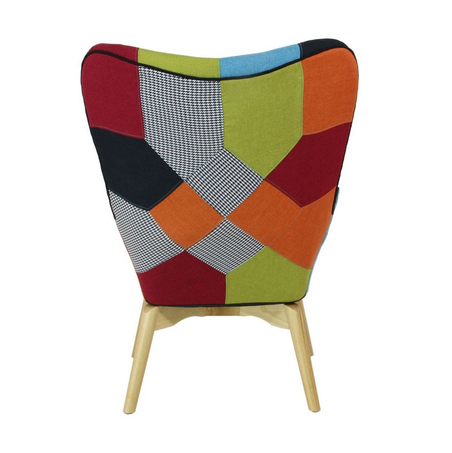 Sillón FREATHER tapizado en tela patchwork multicolor y patas de madera de haya. Medidas: Medida alto: 94 cm. Medida ancho: 78 cm. Medida profundo: 70 cm.