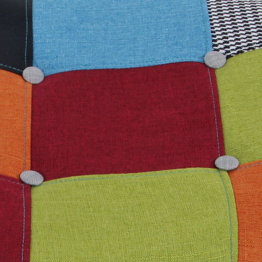 Se trata de un modelo tapizado en tela de poliéster con parches de diferentes colores y, en este caso, algunos de ellos estampados con un motivo de pata de gallo, característica de la tela de patchwork. También incluye unos botones decorativos en el respaldo y asiento.