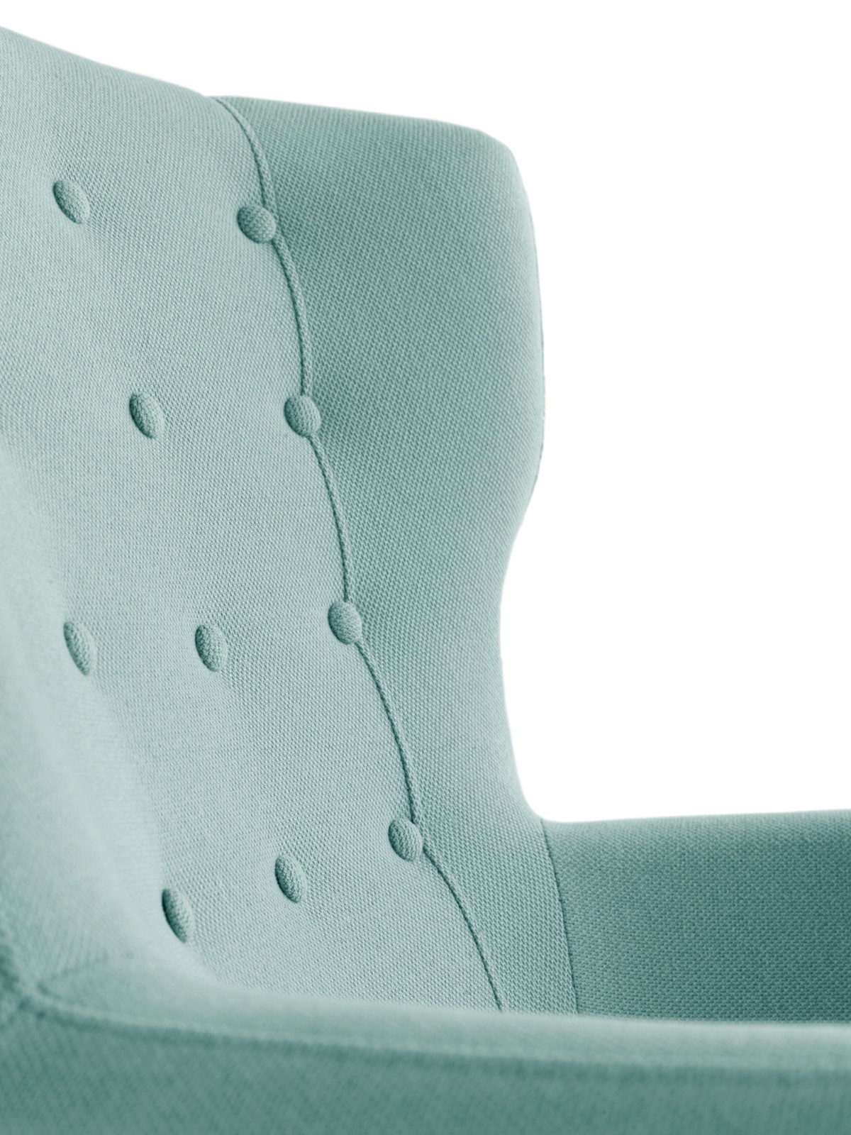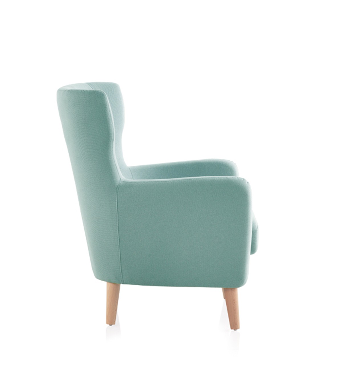 Sillón GÉNOVA con estructura tapizada en tejido color verde y patas en madera de haya natural.