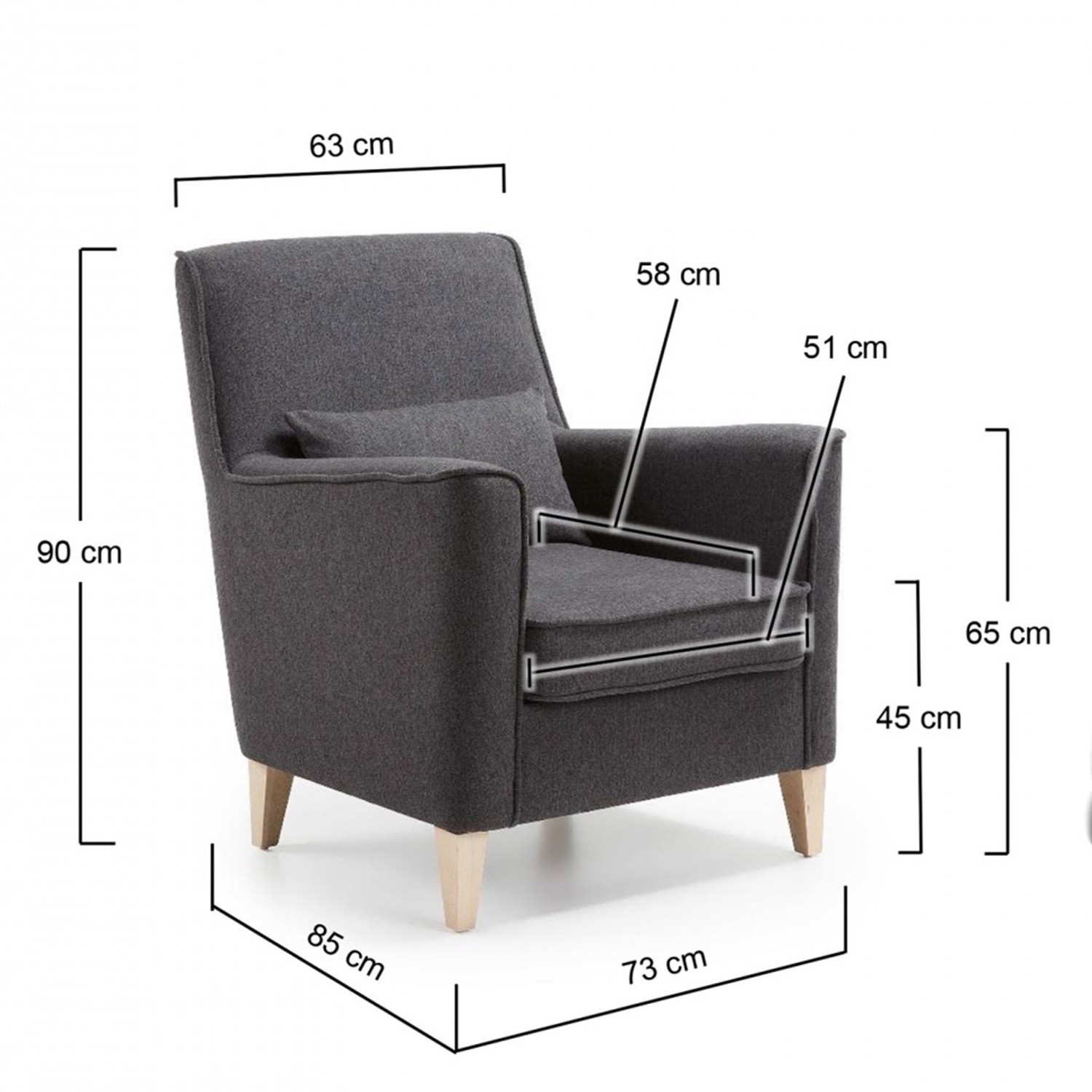 Sillón LECCE tapizado en tejido color antracita y pies de madera de haya natural. Medidas:  Medida alto: 90 cm. Medida ancho: 73 cm. Medida profundo: 81 cm.