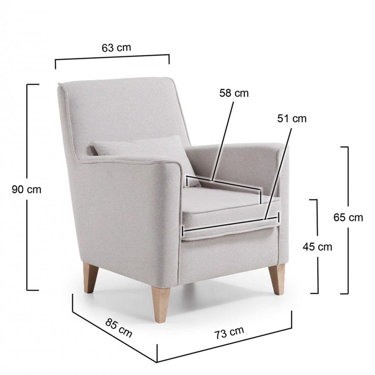 Sillón LECCE tapizado en tejido Varese en color gris y pies en madera de haya natural. Medidas:  Medida alto: 90 cm. Medida ancho: 73 cm. Medida profundo: 81 cm.