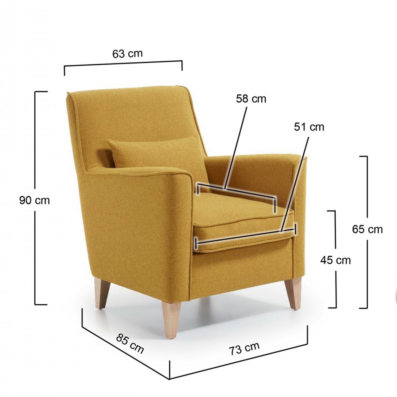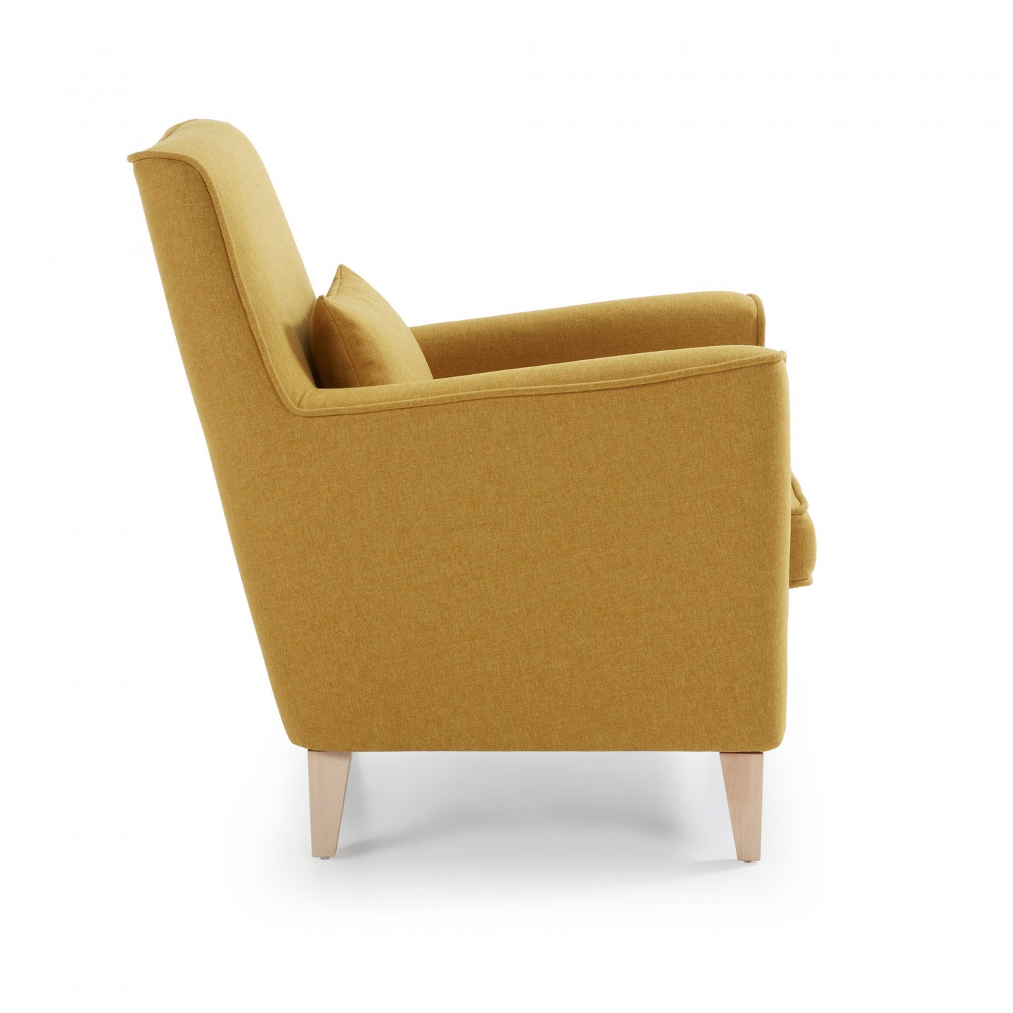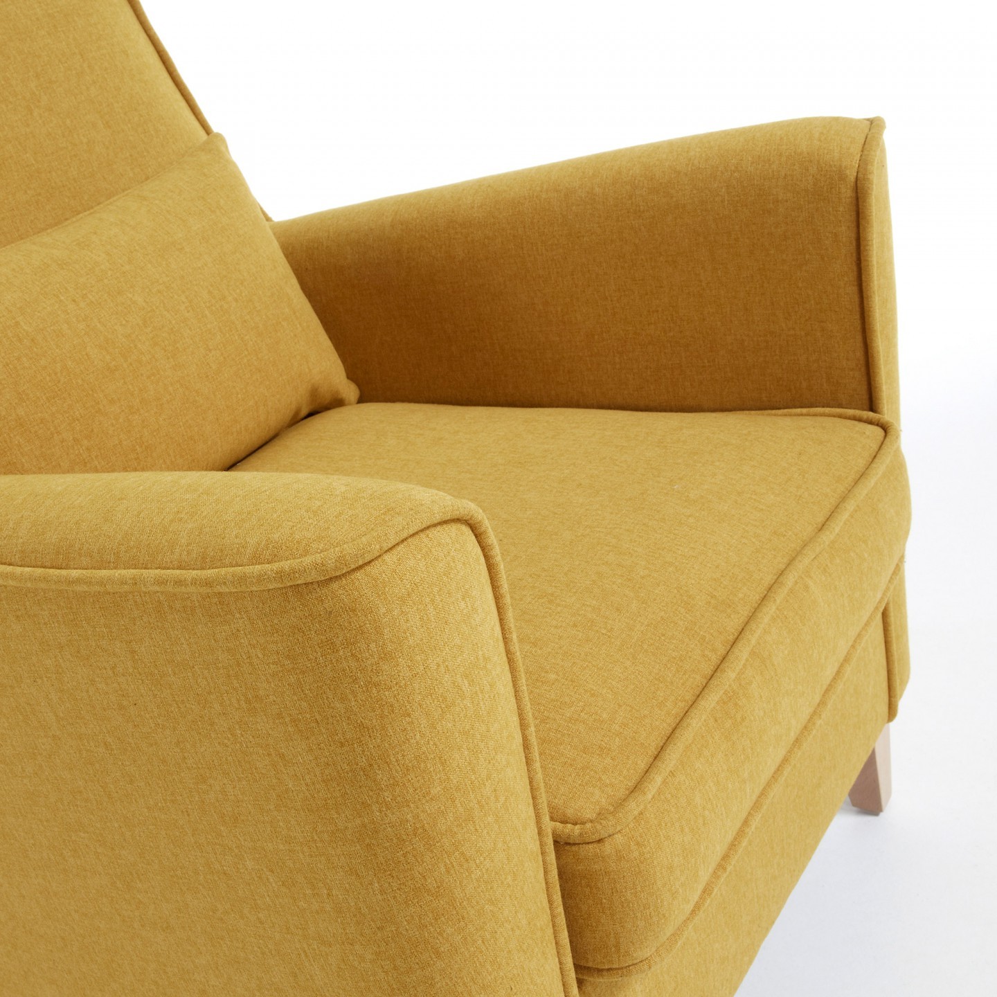Se trata un sillón tapizado en tejido Varese con tratamiento teflon antimanchas acabado en color mostaza, con reposabrazos para que quien lo use obtenga una mayor comodidad, y con cuatro pies de madera natural de haya que mantienen la estructura en pie. Y como detalle extra, también incluido, un fabuloso cojín del mismo color.