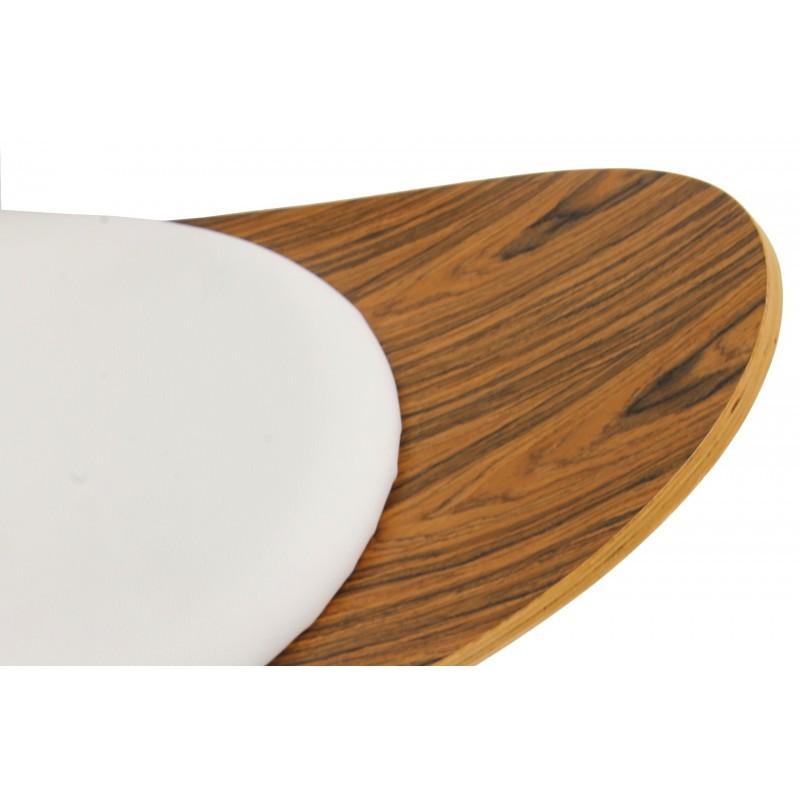 Está formada por una estructura de madera arqueada con tres patas cónicas que la dotan de estabilidad y personalidad. En este caso te la presentamos con acabado de chapa de palo rosa, que se caracteriza por su resistencia, dureza y pesadez. Los cojines que recubren su respaldo y asiento están tapizados en similpiel de color blanco, creando una armonía perfecta entre los dos materiales.