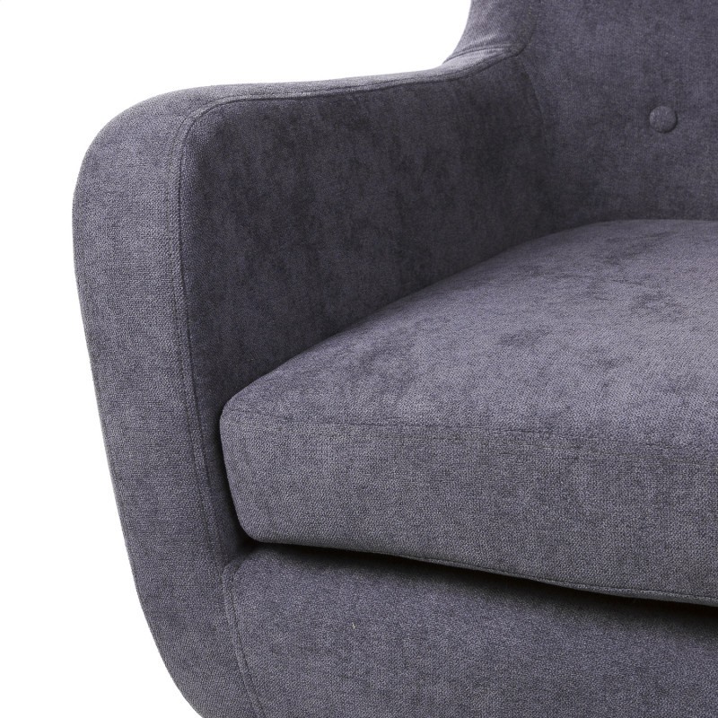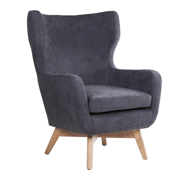 Sillón VEGAS tapizado en tejido gris oscuro con patas cruzadas en madera natural.