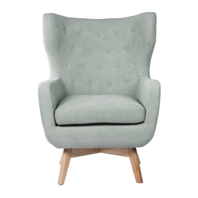 Sillón VEGAS tapizado en tejido verde menta con patas cruzadas en madera natural.