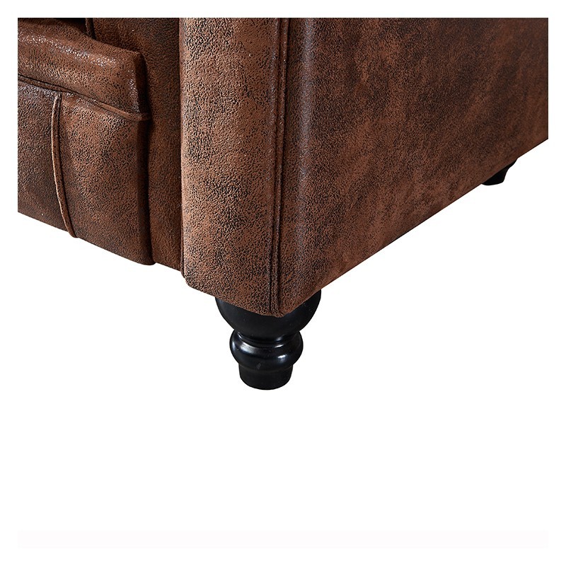 Sus patas y estructura están fabricadas con madera maciza que aporta la solidez necesaria al sofá, y sus asientos, respaldo y reposabrazos vienen tapizados en similpiel, aunando así las ventajas del confort de la piel natural y la durabilidad de la sintética. El confort se consigue gracias al relleno de espuma de poliuterano de gran densidad, que aportan el mix de blandura y resistencia ideal, evitando que se deforme.