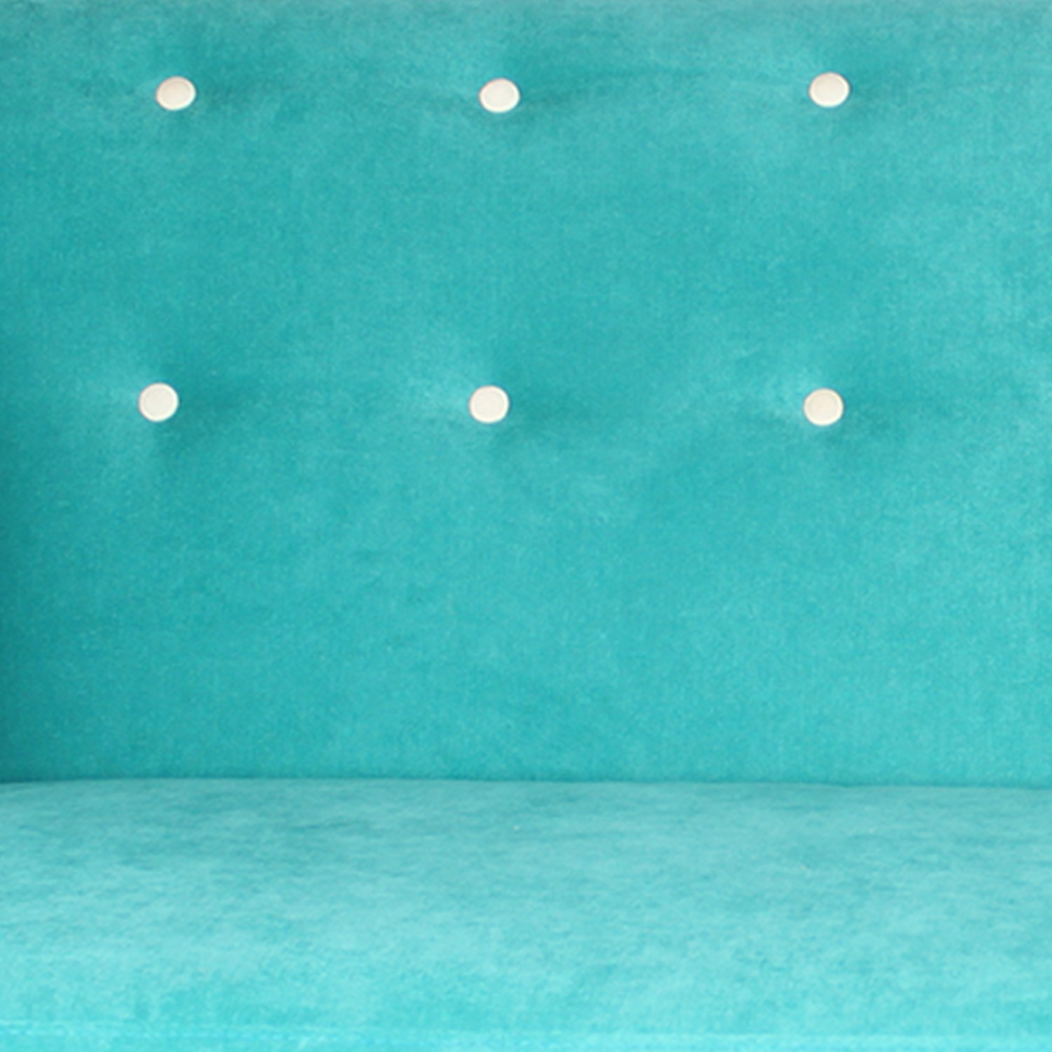 Tapizado en textil velour en color azul turquesa. Asiento de cincha de nea, que es el mejor sistema de suspensión de asientos, recubierto por goma de 2 cm. Los cojines de los asientos tienen una densidad de 35 kg, los cuales están recubiertos por fibra.
