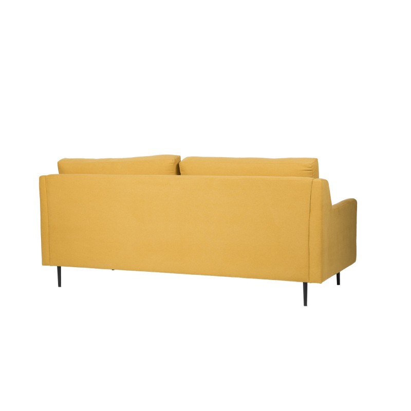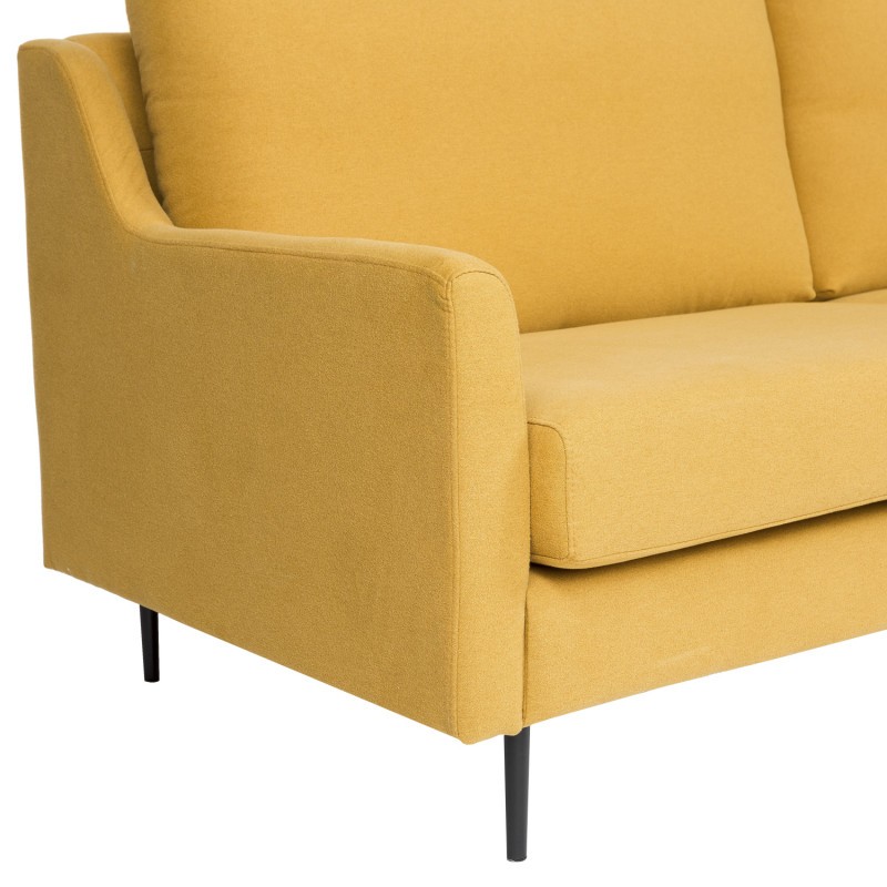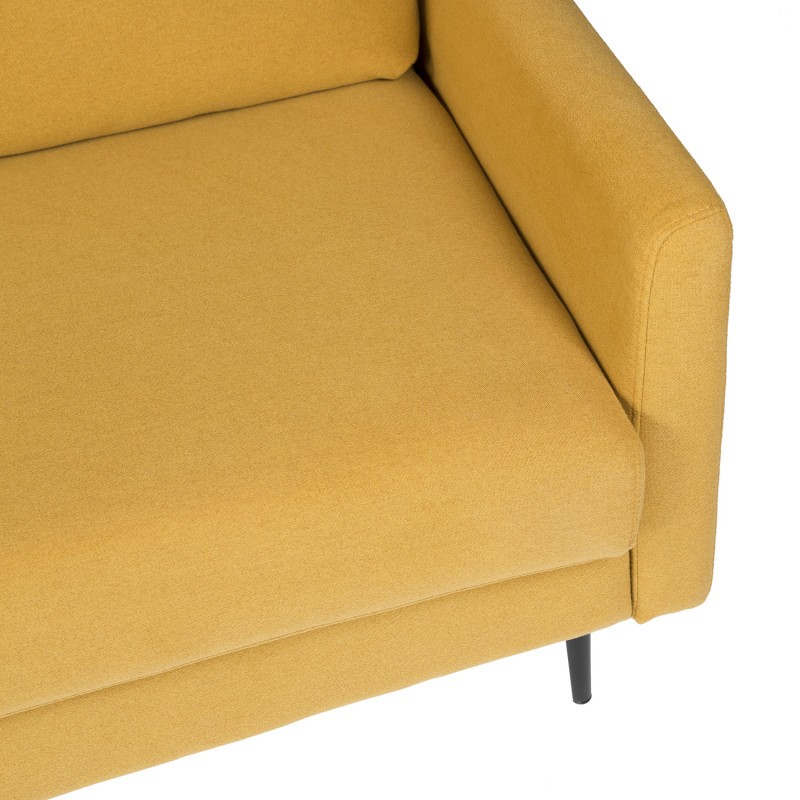 Se trata de un modelo sencillo, pero elegante a su vez. Cuatro patas metálicas acabadas en color negro se encargan de sostener una estructura de grandes dimensiones y tapizada en tejido acabado en un llamativo color mostaza.