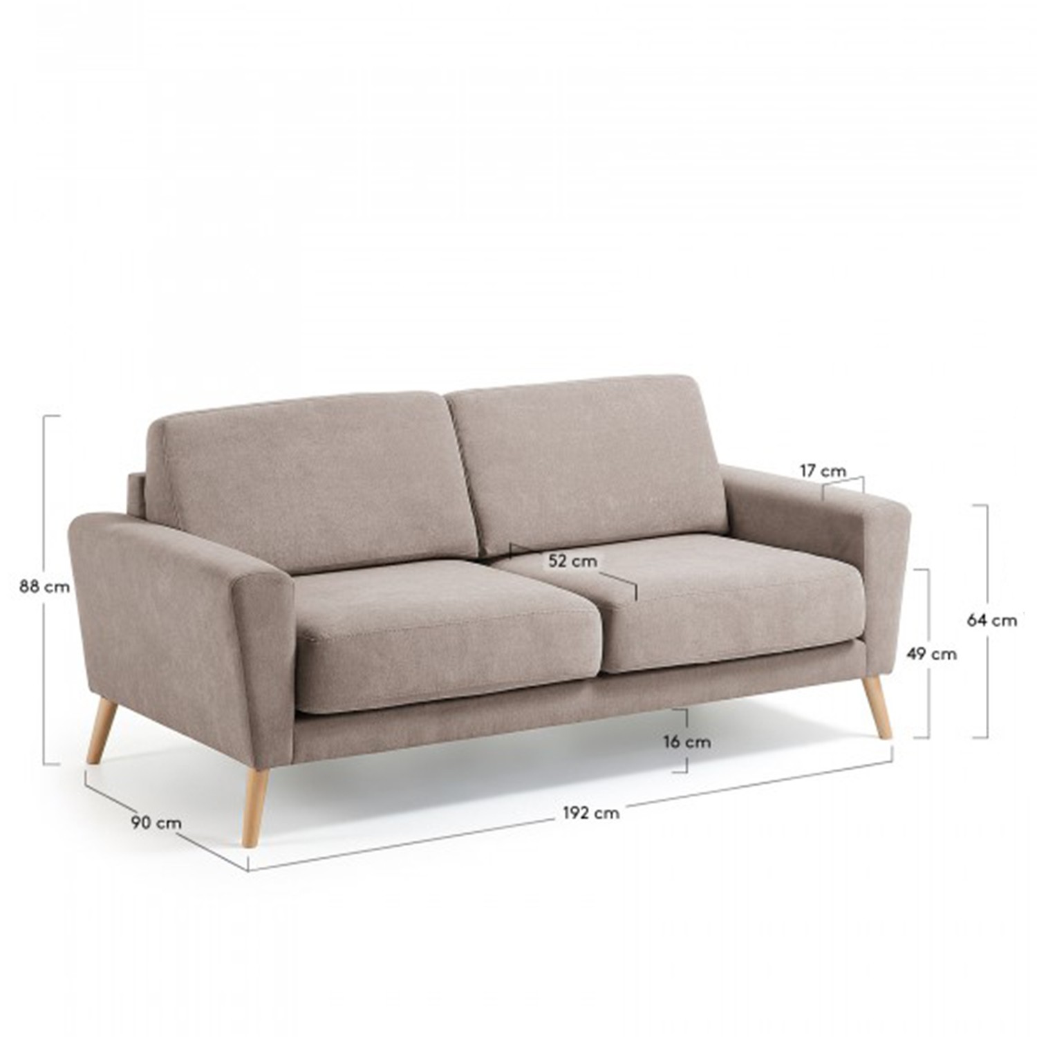 Y ese sofá tiene nombre, y se llama ROGOL. Pensado para tres plazas, consta de un asiento y un respaldo tapizado en tejido de color marrón. Este tejido es desenfundable, lo que te va a permitir poder lavarlo en tu propio hogar de una forma fácil y sencilla. En cambio la estructura está formada por cuatro patas de madera de haya en el color natural propio de dicho material.
