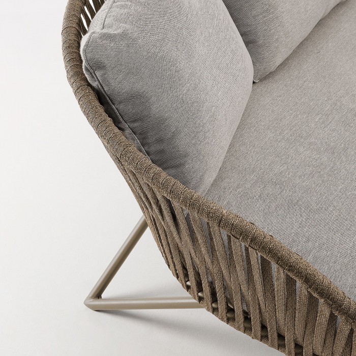 Se trata de un moderno modelo de tres plazas, formado por una estructura de metal en color marrón recubierto por cuerda de poliester del mismo color trenzada manualmente. Además le acompaña un largo cojín a modo de asiento y tres para emplear en el respaldo.