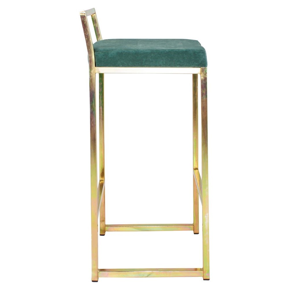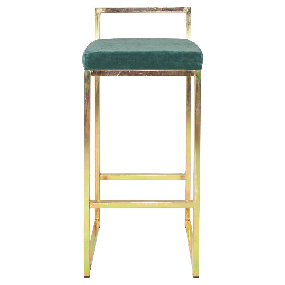 La estructura desde los pies hasta el respaldo está fabricada en metal lacado en color dorado. El asiento, en cambio, está tapizado en terciopelo en color verde.