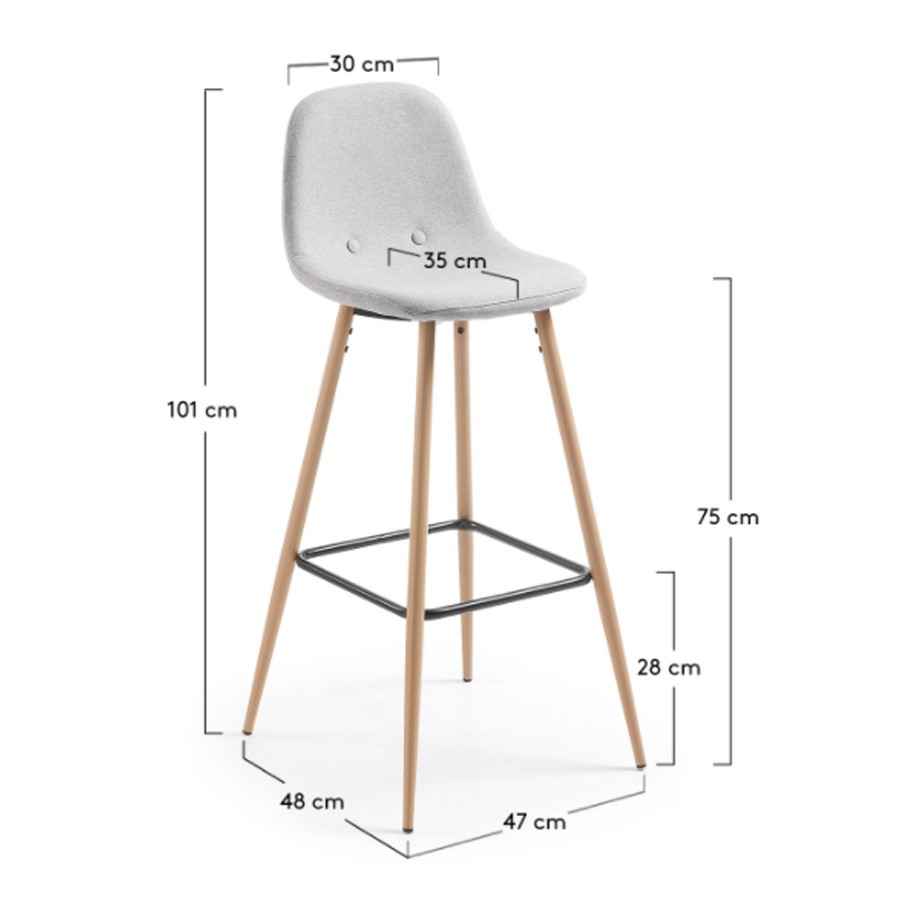 Y en esta ocasión el turno de presentaciones es para el taburete alto ARAMAT. Un taburete de estilo clásico, formado por un asiento y un respaldo unido en una sola pieza, tapizado en tejido de color gris claro y con un par de botones del mismo color en la zona del respaldo a modo decorativo.