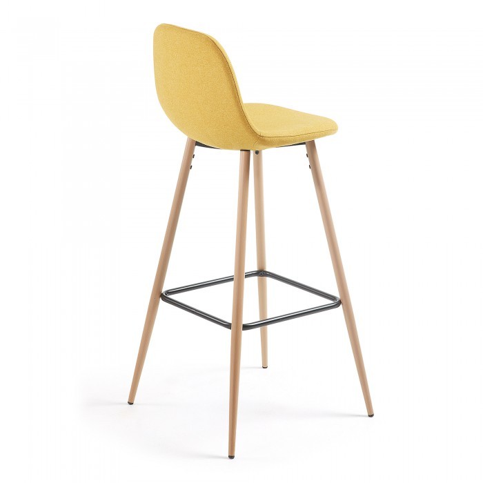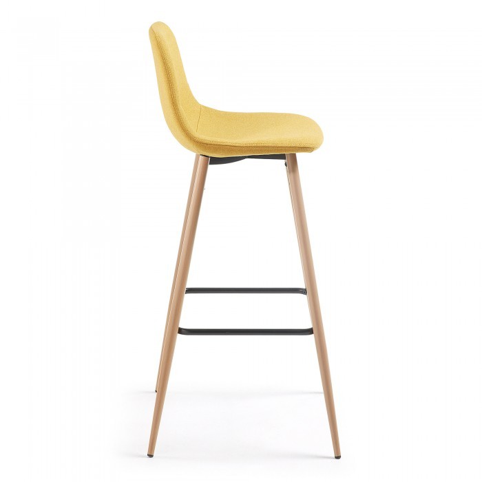 En esta ocasión, el turno de presentaciones le llega al taburete alto ARAMAT, un modelo clásico en el que encontramos un asiento y un respaldo de una sola pieza, tapizado en tejido de color mostaza. En la zona del respaldo, se incluyen también dos botones del mismo color a modo decorativo. En cambio, las cuatro patas son de acero, pese a que están acabadas simulando madera de haya.