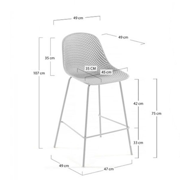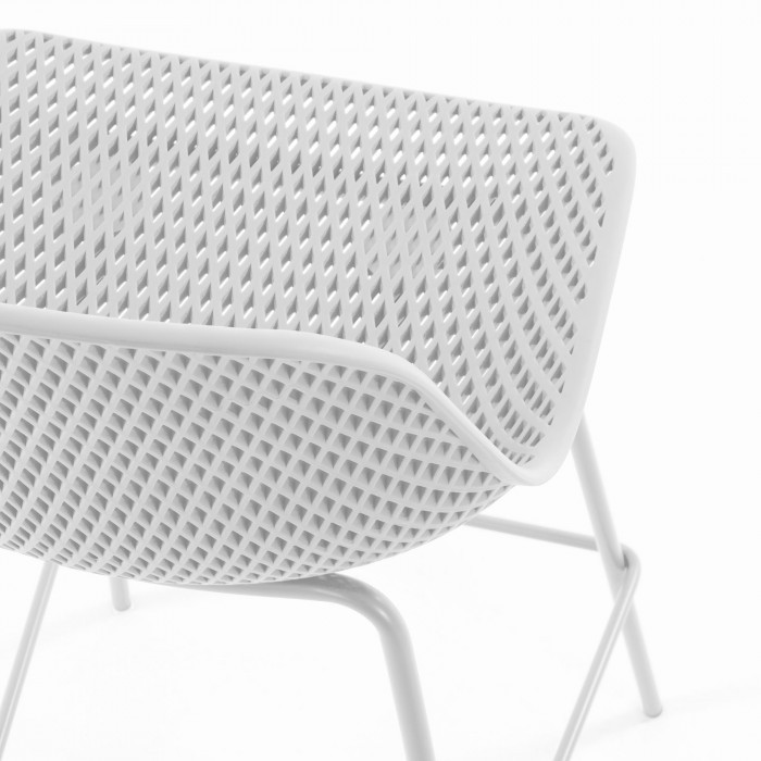 Lo forma un asiento y un respaldo de pieza única, realizado en plástico perforado reciclado acabado en color blanco, y le acompaña una estructura de cuatro patas diseñadas en metal y con terminación en el mismo color.