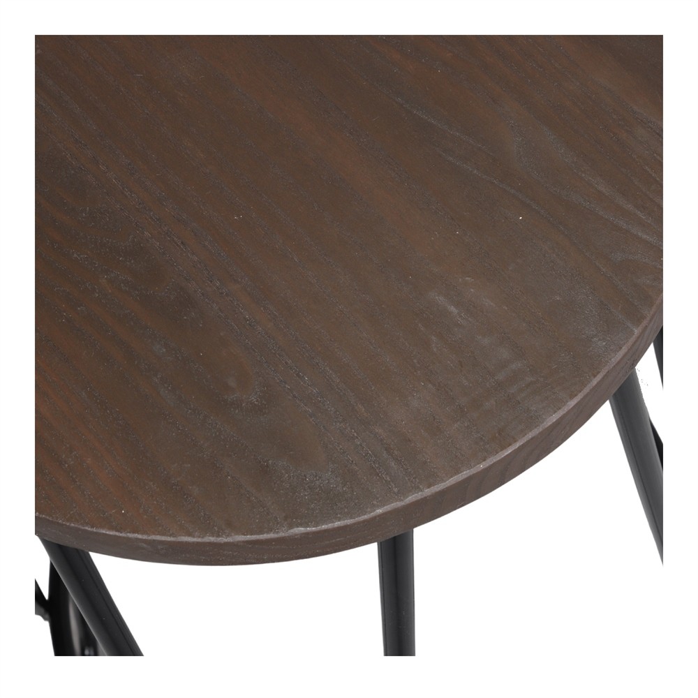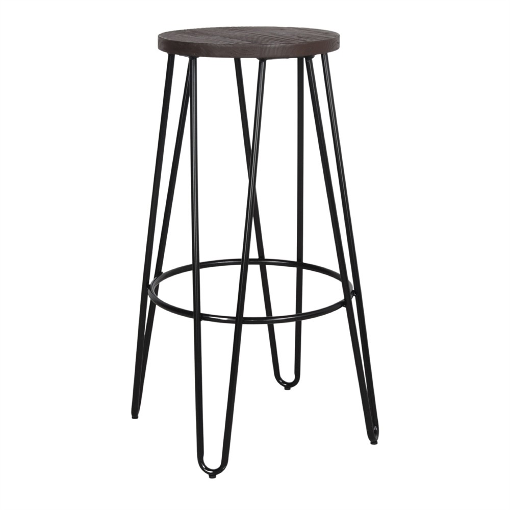 Empezando por su estructura de patas, éstas están fabricadas en metal color negro, disponiendo de un aro circular casi en la base que sirve de reposapies. Siguiendo por el asiento, el cual está fabricado en madera envejecida, también tiene una forma circular. El asiento de madera puede variar ligeramente al tratarse de un material natural.