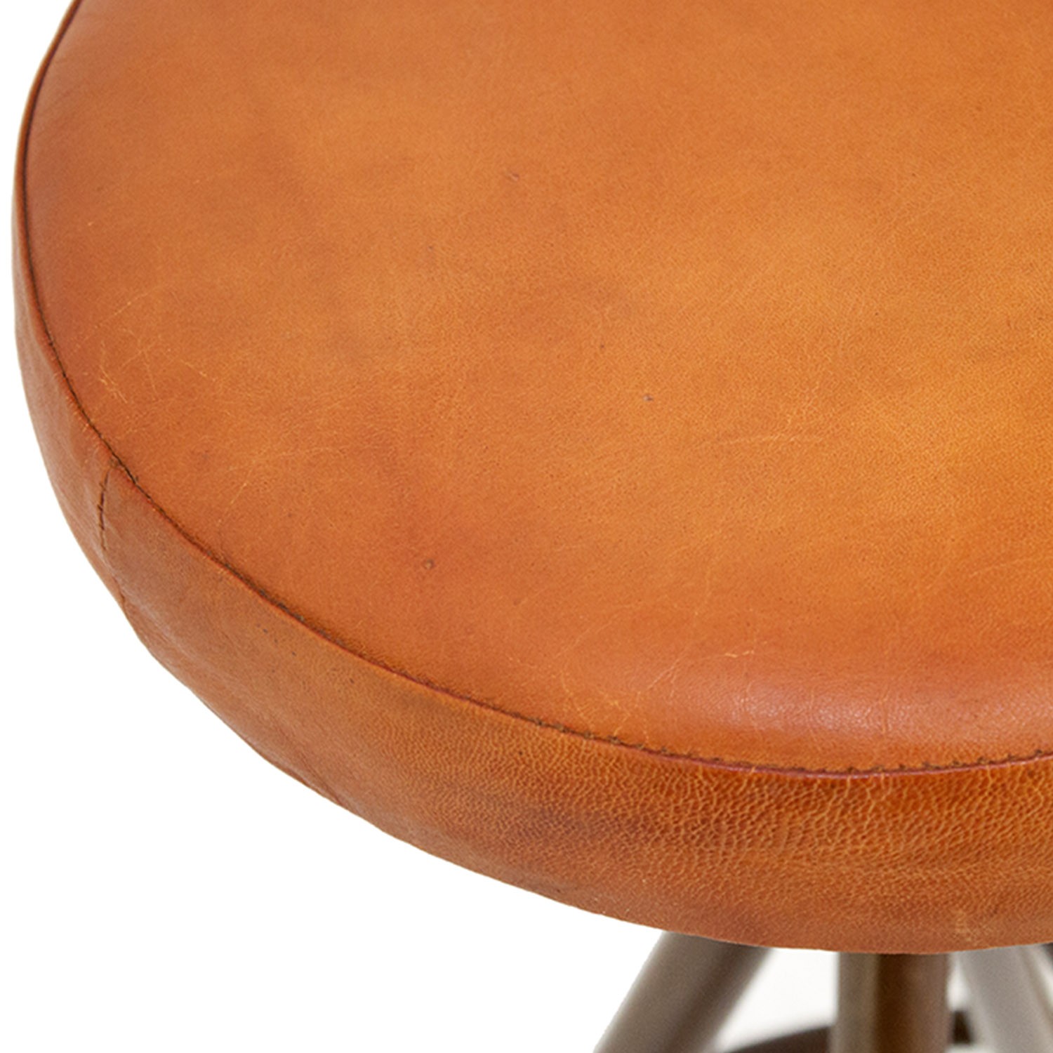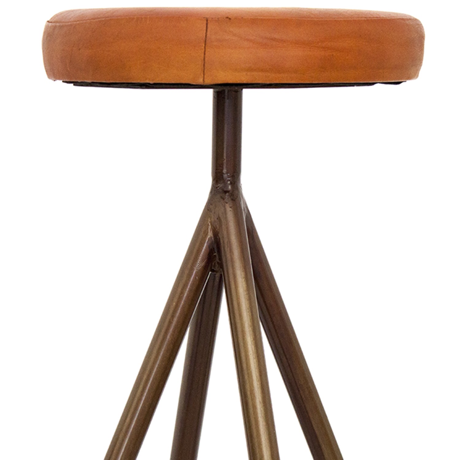En esta ocasión le toca el turno al taburete alto FELICAI. Un modelo formado por un asiento redondo diseñado en cuero de color marrón, y que puede variar ligeramente respecto a las imágenes. Por otro lado, encontramos una estructura de cuatro patas de metal en color óxido, con un reposapies redondo incluido, en forma piramidal.