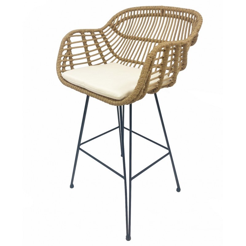 Su asiento y respaldo fabricado en ratán sintético de color beige, dispone de un cojín esponjoso en color blanco para una mayor comodidad, su base de metal lacado en color negro hace que sea un taburete muy resistente. Es muy fácil de combinar con estilo casual, boho, étnico y tropical.