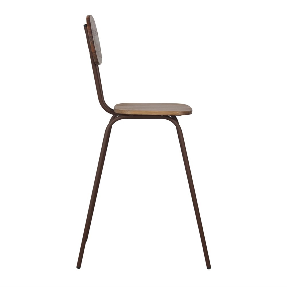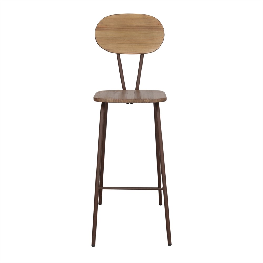 Se trata del taburete alto NAVAS, donde su estructura de pies y la unión entre el asiento y el respaldo está fabricado en metal en acabado en óxido. Disponiendo, además, de reposapies para que te acomodes mucho más cuando te sientes.