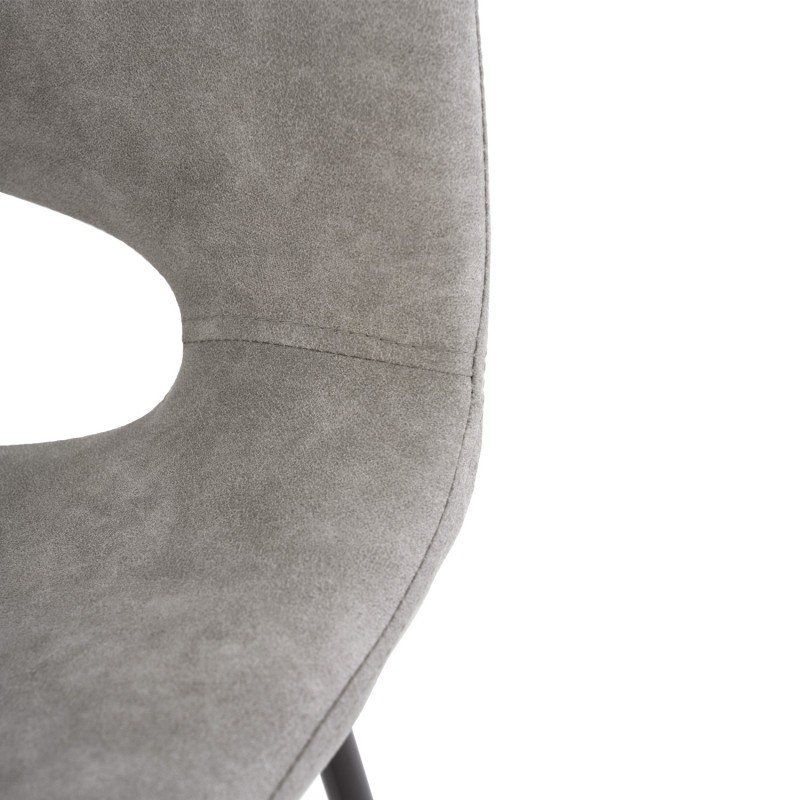 Mezcla el tejido en poliester de color gris claro, con el que está realizado el asiento y el respaldo, con el metal en color negro con el que ha sido diseñado toda su estructura en forma de patín. Dispone de reposapies para una mayor comodidad. Destaca la forma original de su respaldo al disponer de un hueco justo al final del asiento.