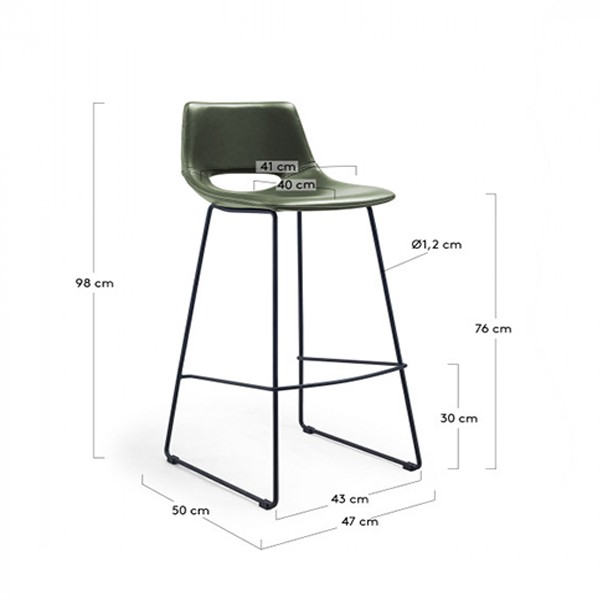 Taburete alto RHAPSODY realizado en polipiel de color verde y metal acabado en negro. Medidas:  Medida alto: 98 cm. Medida ancho: 47 cm. Medida profundo: 50 cm. Medida alto asiento: 76 cm.