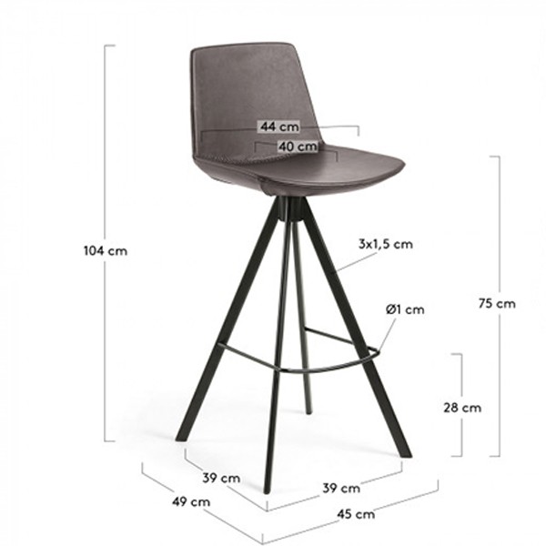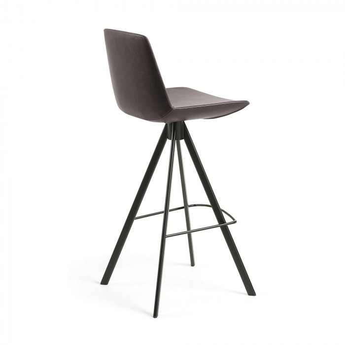 En este caso, la presentación le llega al taburete alto SAGAR. Lo forma un asiento y un respaldo de pieza única, de lineas rectas y tapizado en polipiel en color marrón oscuro. Todo ello se sostiene mediante cuatro patas de metal pintado por pulverización en color negro, y presentadas en forma piramidal.