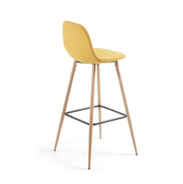 El taburete bajo ARAMAT es un modelo agradable, especialmente destinado a ambientes nórdicos, formado por un asiento y un respaldo tapizados en tejido acabado en una colorida tonalidad mostaza. Comparten protagonismo con esta estructura, cuatro patas que parecen realizadas en madera de haya natural, aunque únicamente es un efecto, puesto que son metálicas.