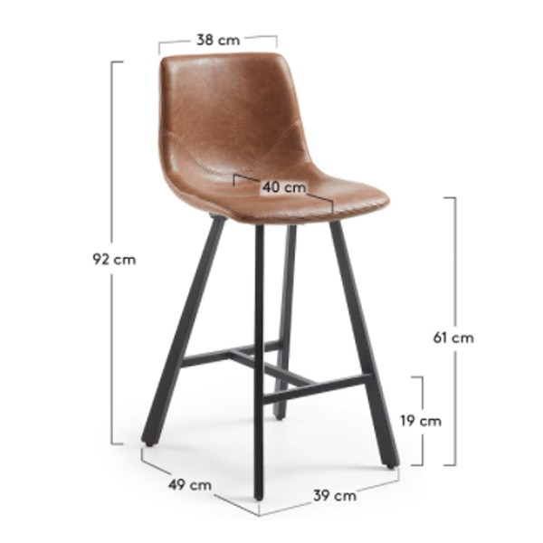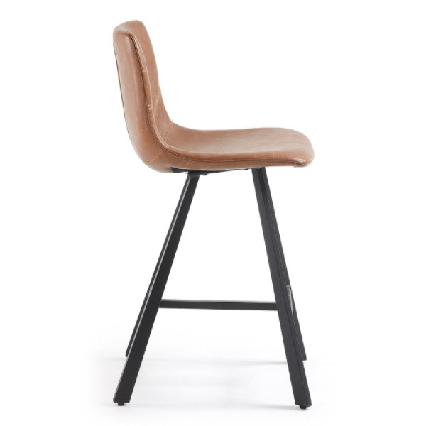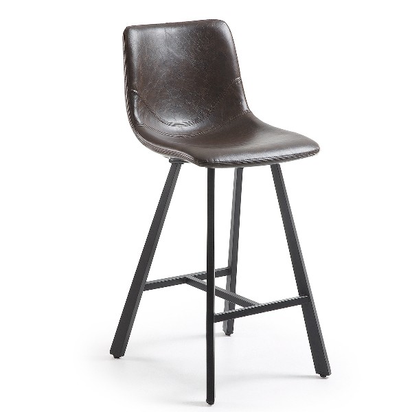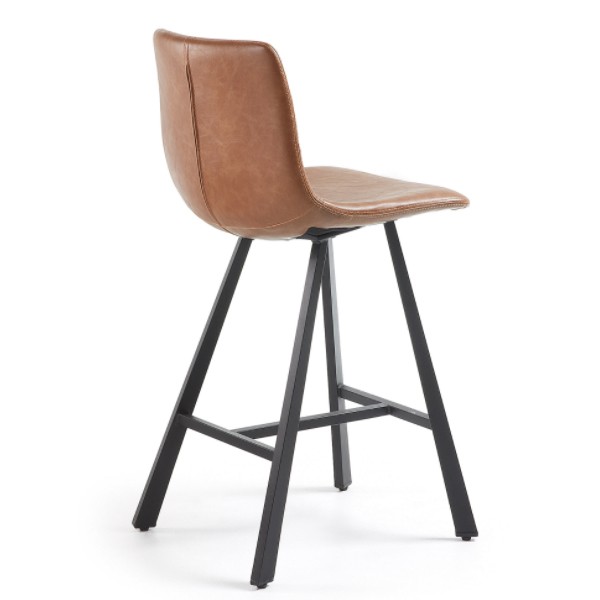 Y entre tanto taburete bajo disponible en el mercado, hoy le hemos puesto el ojo a DIVINE. Se trata de un taburete bajo de estilo vintage, compuesto por un asiento y un respaldo que recoge perfectamente tu espalda y que se encuentra tapizado en polipiel en color marrón claro, y una estructura de cuatro patas en forma piramidal, diseñadas en metal y pintadas mediante pulverización, en esta ocasión en color negro.
