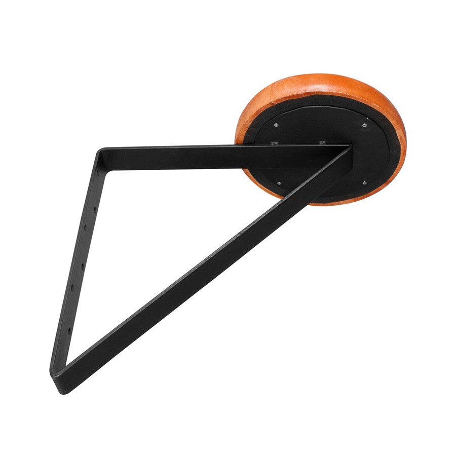El taburete de pared MUUR consta de una estructura triangular de metal en color negro y de un cómodo asiento circular de piel marrón.