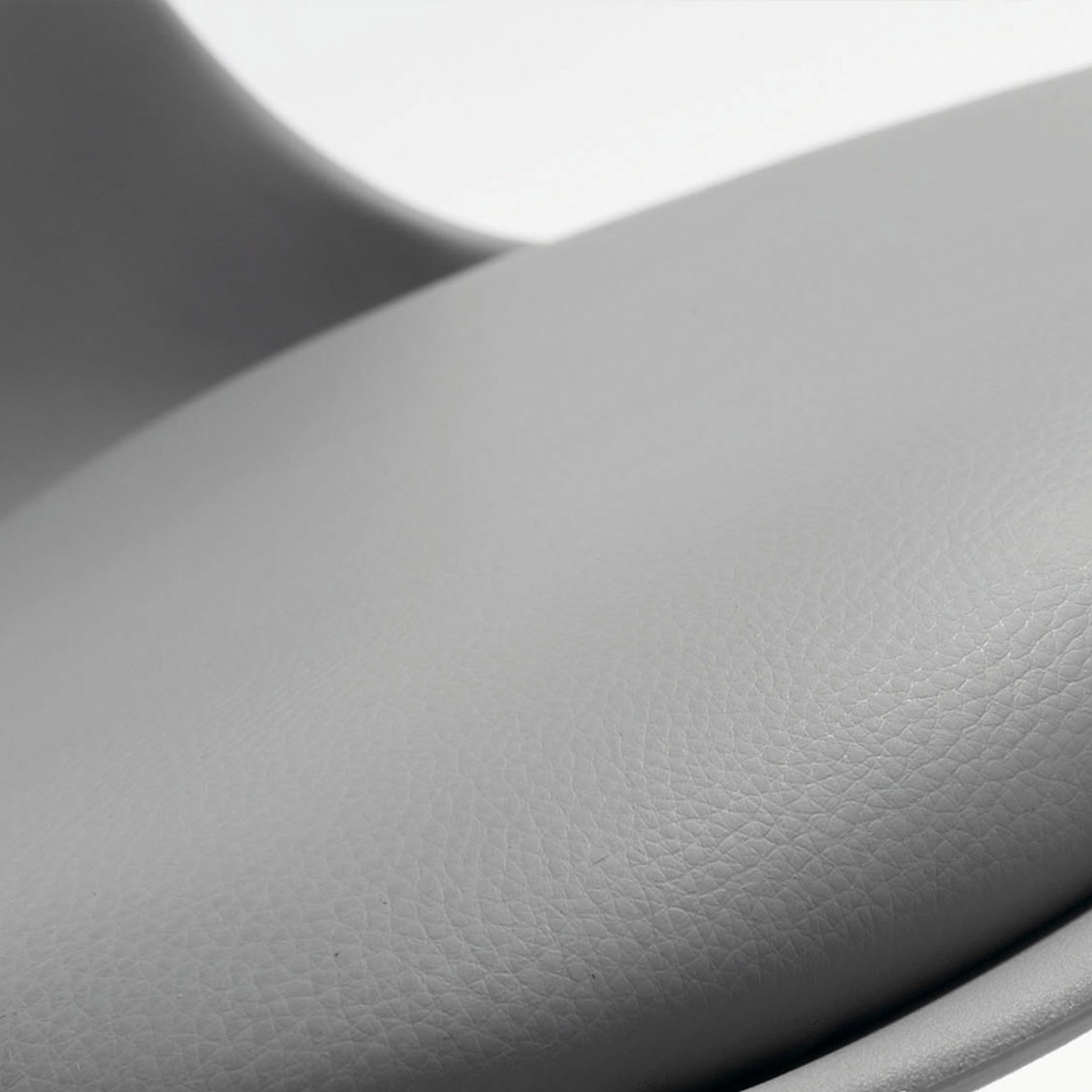 Su asiento y respaldo se fabrican en polipropileno gris de alta calidad junto a un tapizado de polipiel resistente y duradero también gris en el mismo asiento.