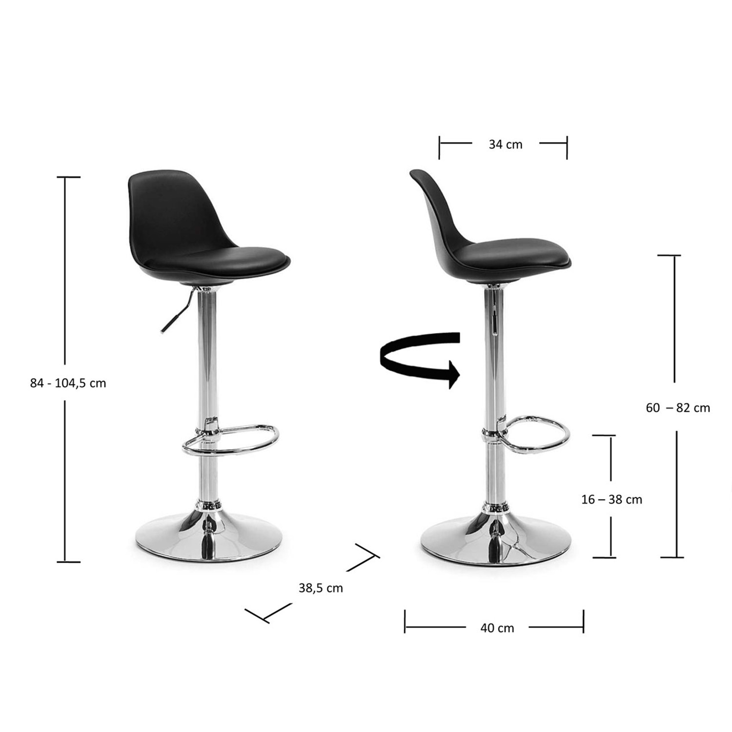 El taburete regulable ORLANDO FLAK se fabrica con una robusta estructura giratoria con un solo pie en metal cromado con elegante reposa pies que permite su regulación en altura en hasta 20 cm mediante pistón de gas y su giro de 360 grados.
