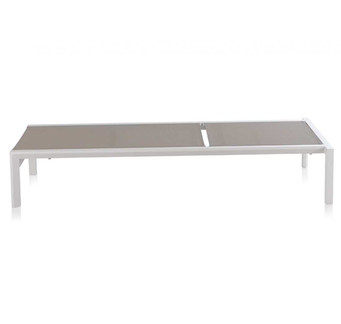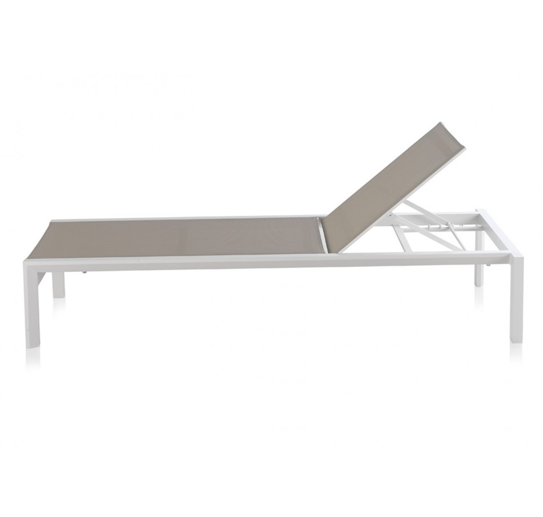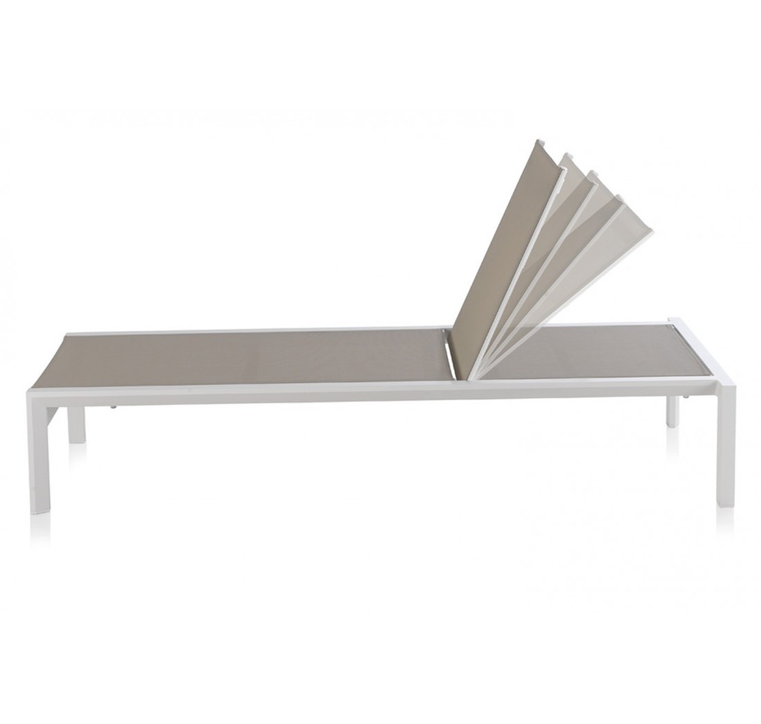 La tumbona DECK tiene una estructura fabricada en metal de color blanco y textilene de color taupe su asiento y respaldo; el cual puedes regular su altura, ya que dispone de varias posiciones.