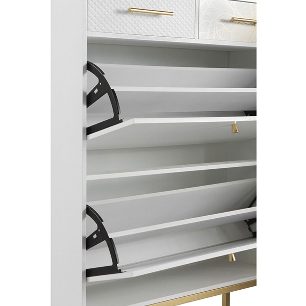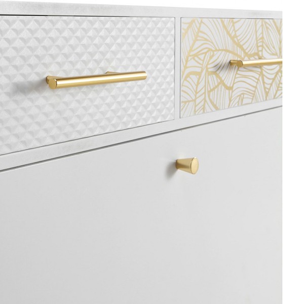 Este zapatero con tres cajones SHEET, está compuesto por dos cajones para zapatos y dos pequeños cajones para almacenaje extra, ya sea para el joyero, corbatas... Realizado en DM de color blanco, con patas metálicas doradas y tiradores a juego. Además de un bonito dibujo frontal en uno de los cajones superiores de unas hojas tropicales doradas. Capacidad aproximada para 12 pares de zapatos.